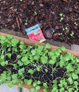 Lolli and I planted a radish garden in a container. The seeds wasted no time sprouting and growing. To ease the mind of those in the gardening ‘know’, we have thinned them out once, and will do it again in a couple of days. As I knelt down to tend the little plants, my eyes were drawn to some nearby greenery in the mulch where we had the container when we did our planting. The little green heads popping up are identical to the ones in the radish garden. Looks like some of the radish seeds slipped through Lolli’s fingers and found a spot to grow on their own.