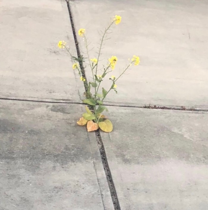 On my daily walks by her home, I spotted this dandelion, insistent on growing in the middle of her driveway in a front yard that is really quite well tended. Day after day, as I walk by, I enjoy seeing this wildflower getting taller and taller, being left alone to grow. I don’t know if anyone else notices it, but I sure do!